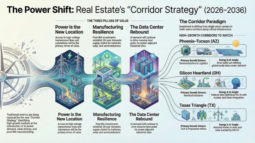 Investment opportunities are shifting from single urban centers to multi-metro corridors. Data centers and clean-energy generation require vast footprints, dictating development at the urban fringe or along critical transmission arteries.